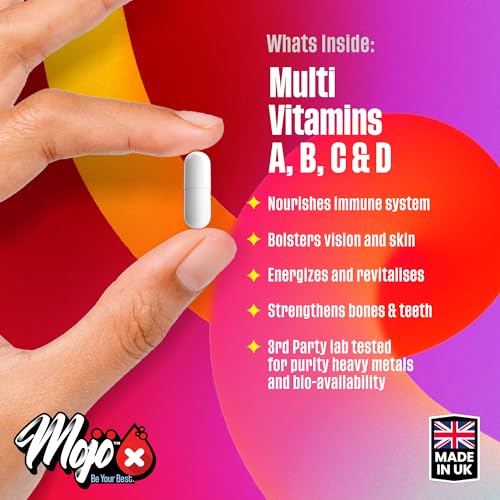 Welcome to the World of Wellness with MOJO Multi-Vitamin - One a Day! This isn't just a supplement; it's your daily dose of superhero strength, packed into one tiny, mighty capsule. Designed for the health-conscious and the wellbeing warriors, this multi-talented pill is like the Avengers of vitamins: Vitamin C, D, A, B complex, and E, all joining forces to ensure you're at your best, every day. Say goodbye to taste bud tantrums! MOJO Multi-Vitamin is as discreet as a ninja - tasteless, effortless to take, and your secret weapon in the daily health battle. Pill, tablet, capsule, or gummy – whatever your style, we've got your back. It's not just a multivitamin; it's an immune system's dream come true, delivering the vital minerals your body craves. Proudly manufactured in the UK under GMP conditions, MOJO Multi-Vitamin is the James Bond of supplements – sophisticated, reliable, and always meeting ISO quality standards. Our commitment to quality isn't just talk; it's a promise, with every supplement crafted in Great Britain for unmatched excellence. Not just satisfied, but over the moon - that's our goal for you. If MOJO Multi-Vitamin doesn't make you feel like a wellness warrior, we've got a 100% refund with your name on it. No questions, no fuss – that's our Money Back Guarantee. It's time to turn the page to a healthier chapter with MOJO Multi-Vitamin - One a Day. Feel the MOJO difference and arm your body with the ultimate multi-mineral and multivitamin shield it deserves. 120x Capsules, its a value Winner! Dive into the world of elevated health and vitality – your MOJO journey starts now!