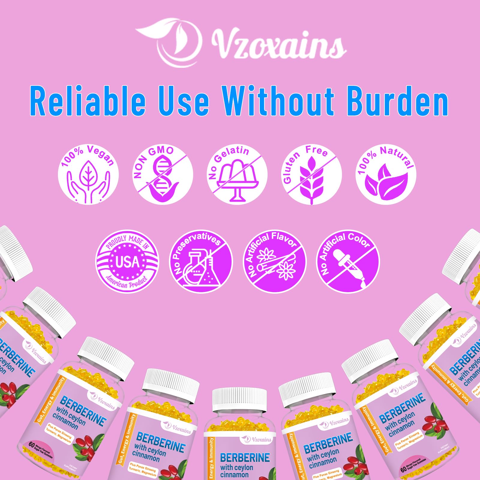 - [Why Vzoxains? Trusted by Millions] Our natural berberine gummies supplements are manufactured, tested, and bottled in a GMP-certified facility with the highest quality, potency and safety, We believe you and your family deserve the best. Any questions please contact us directly via email, our US-based "online" support team will take care of you right away. our US-based "online" support team will take care of you right away.