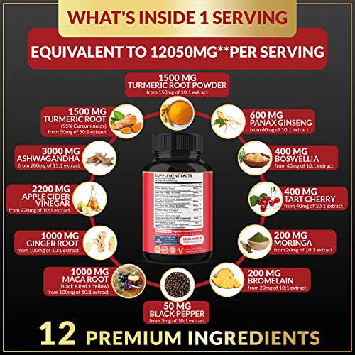 - 11-in-1: Turmeric Curcumin, Ashwagandha, Apple Cider Vinegar, Ginger, Maca, Panax Ginseng, Boswellia, Tart Cherry, Moringa, Bromelain, and Black Pepper.