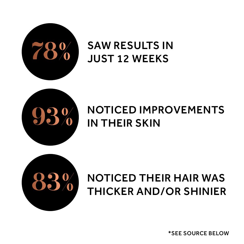 - REAL RESULTS: Our loyal customers consistently feed back about the benefits of drinking collagen on their hair, skin, nails and overall well-being. Based on an AC Brand Discovery & Consumer self-assessment study, 93% of our customers noticed an improvement in their skin whilst 83% noticed their hair was thicker and/or shinier.