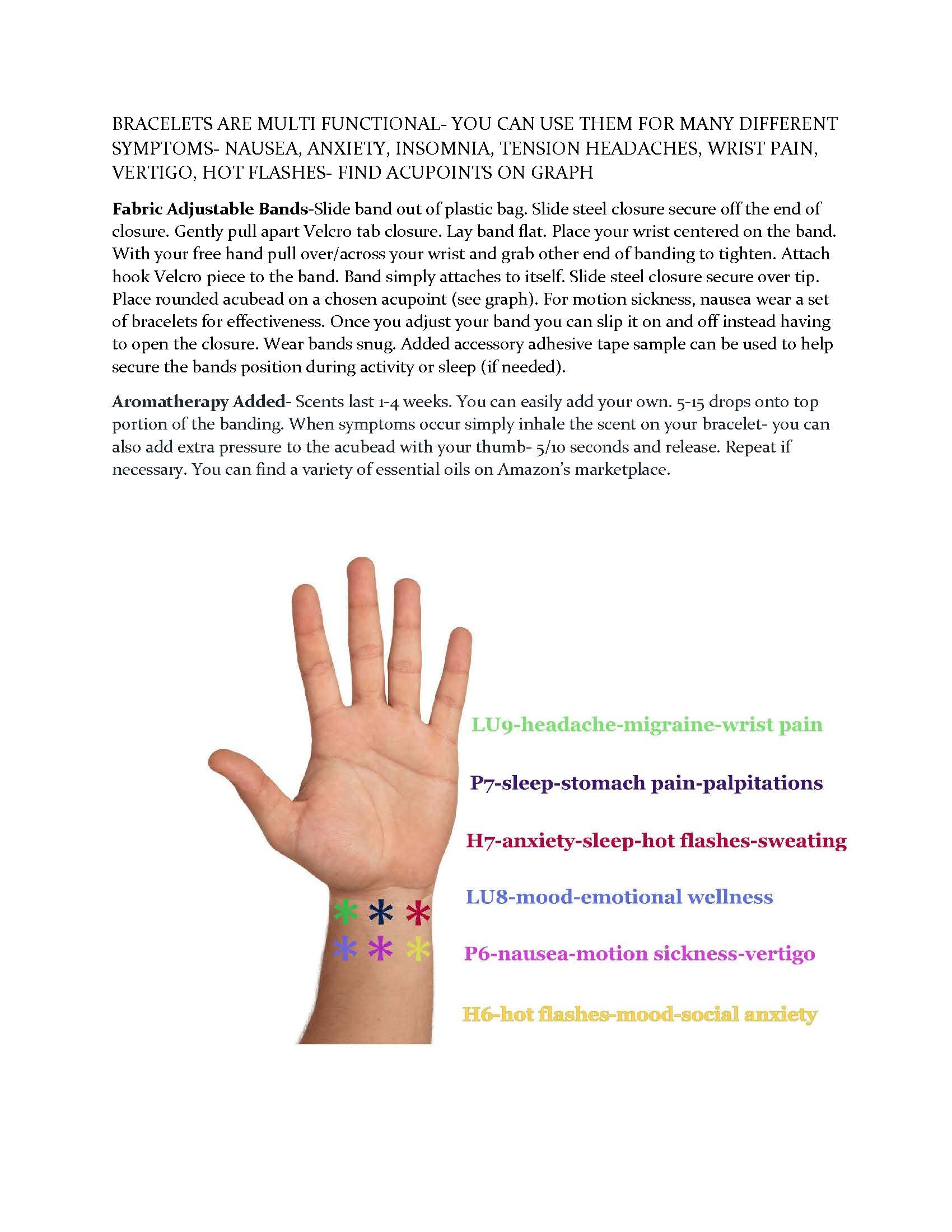 Details: How does the Rose Scented AcuBracelet Work? This multi symptom acubracelet utilizes 3 acupoints to help calm anxiety, stress, physical/emotional pain, hot flashes, sleeplessness with the added benefits of Rose Essential Oil (stress, antidepressant, pain relief). Simply inhale the fragrance when experiencing symptoms. Full diagram included with detailed information regarding acupoints. All points are on wrist crease area and easy to locate. AcuPoint Information and Location H7 aids to treat insomnia, irritability, stress, emotional imbalances, nervousness, anxiety, hyperactivity, palpitations. P7 relieves insomnia, stress, hot flashes, manic behavior, palpitations, sweating, stomach pain, and vomiting. LU9 relieves palpitations, stress headaches, nervousness, poor circulation, headache, migraine, and wrist pain. H6 is used for relieving anxiety, irritability, hot flashes, night sweats, panic attacks. P6 relieves nausea, motion sickness, morning sickness, carpal tunnel, menstrual cramp nausea. LU8 is used for emotional well being. With the Added Benefits of Rose essential oils- relieves stress, fights anxiety, eases pain, sleep, increases libido, and smells amazing. Materials and Information Certified Medical Banding Material Manufactured in the USA. Bracelets are ¾” in width. Simple Hook and Loop Closure for Adjust Ability. Added polished steel loop secures the end of the closure. Latex free accessory adhesive tape sample to prevent slippage or placement issues. Rose essential oil made in the USA. If you are new to acupressure/pressure point therapy allow your body a few days to acclimate and be consistent with use before or during onset of symptoms. Results should occur 1-7 days after regular use. Bracelets should be snug yet comfortable. There are many clinical studies online regarding rose essential oil at the National Library of Medicine.