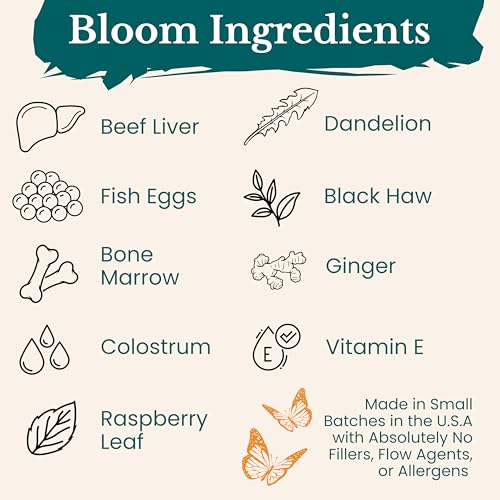 - HIGHEST QUALITY INGREDIENTS: Bloom is made in small batches in the USA without GMOs, Additives, Fillers, or Flow Agents. Bloom is third party tested for purity. Liver, fish eggs, colostrum, bone marrow organs are sourced from 100% grass-fed/grass-finished cows, pasture-raised without hormones in green fields. Our healing herbs are all natural and sourced sustainably.