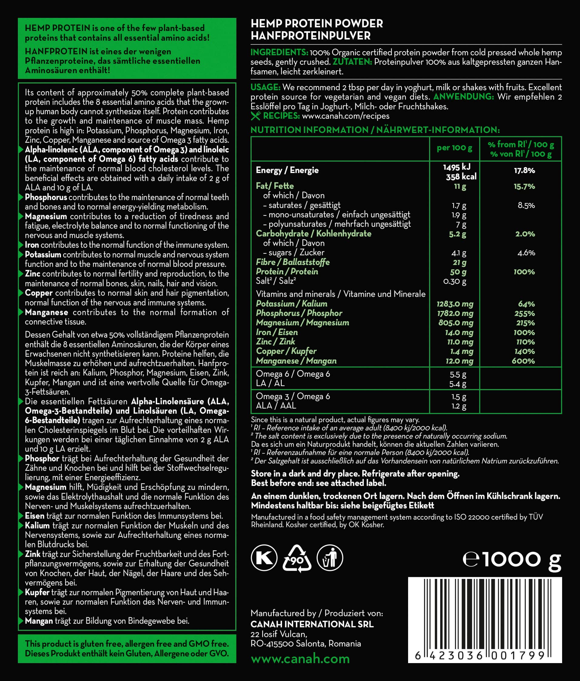 Canah® Natural Hemp Protein Powder 1 kg Vegan, High in Protein, Fibre, Omega 3 & Omega 6, Amino Acids, Vitamins and Minerals, Certified Kosher + Free Bonus Recipes