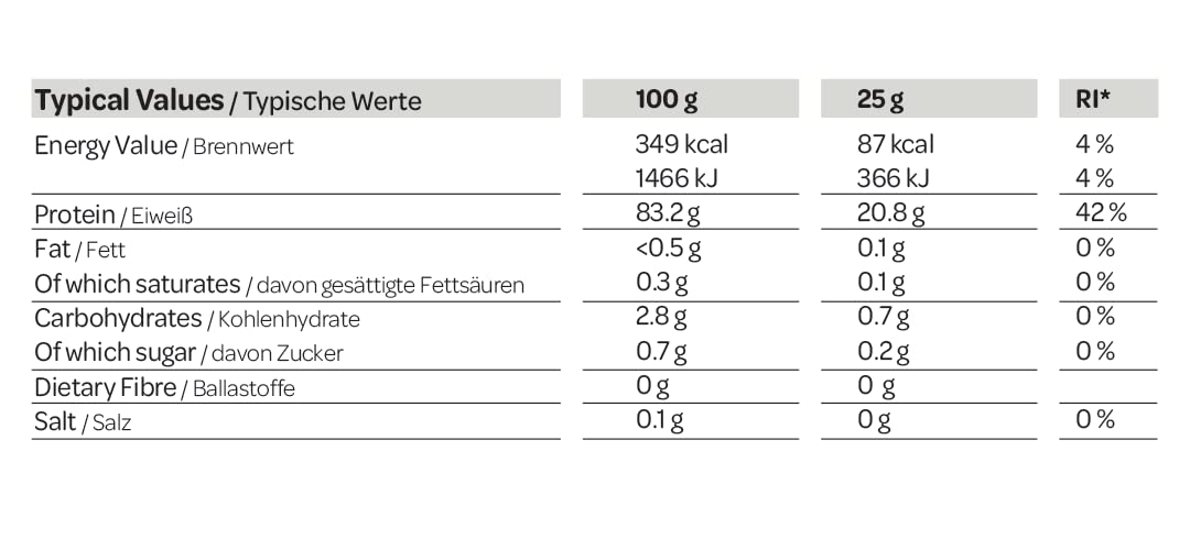 - COMPLETE NUTRITION - 20.8 g Protein, 0.1 g Fat, 0.7 g Carbs per serving.