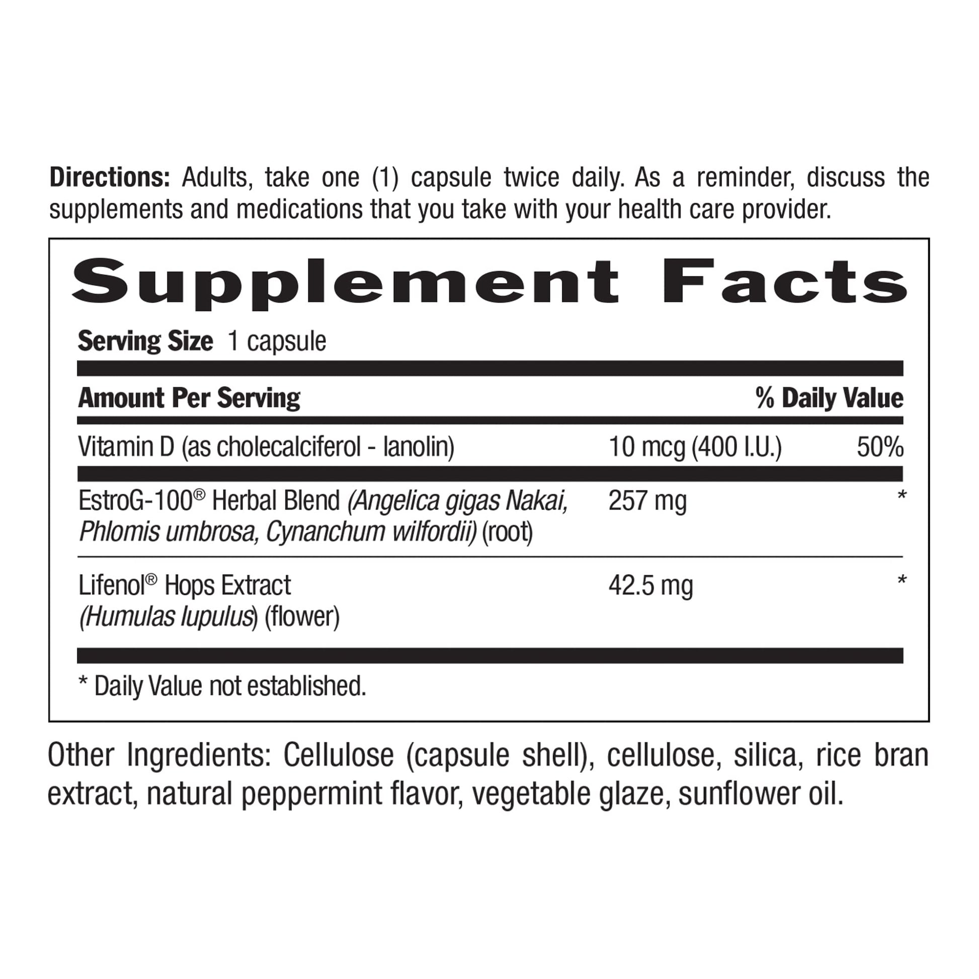 Don’t let menopause control your life! Country Life’s Menopause Rescue™ is a multi-symptom formula that combines key clinically tested ingredients to help reduce the major dreadful symptoms of menopause and helps improve the quality of life of menopausal women.** Feel full of life again!** #poweryourgreatness™ EstroG-100® Herbal Blend (Angelica gigas Nakai, Phlomis umbrosa, Cynanchum wilfordii) (root) 257 mg Lifenol® Hops Extract (Humulus lupulus)(flower) 42.5 mg Serving Size 1 Capsules Servings Per Container 60 Amount Per Serving % Daily Value Vitamin D (as cholecalciferol - lanolin) 10 mcg (400 I.U.) 50% EstroG-100® Herbal Blend (Angelica gigas Nakai, Phlomis umbrosa, Cynanchum wilfordii) (root) 257 mg * Lifenol® Hops Extract (Humulus lupulus)(flower) 42.5 mg * * Daily Value not established. Other Ingredients: Cellulose (capsule shell), cellulose, silica, rice bran extract, natural peppermint flavor, vegetable glaze, sunflower oil CAUTION: Not for use by pregnant or nursing women. If you are taking medication, have a medical condition or planning surgery, consult a doctor before using this product. Stop using and consult a doctor if any adverse reactions occur.