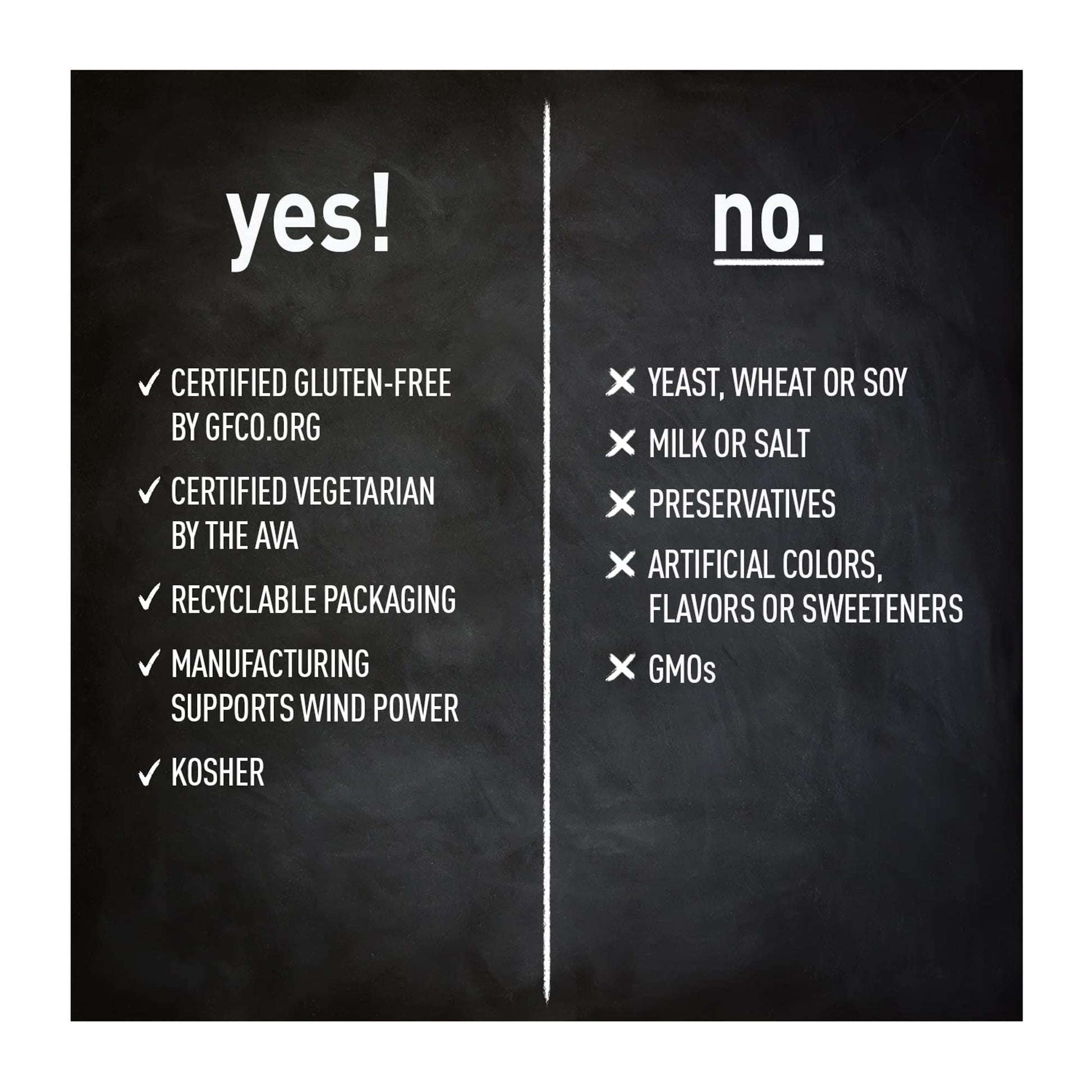 - Responsibly made - Certified Gluten-Free. Made with recyclable packaging and the manufacturing of this product supports wind power. This product does not contain wheat, yeast, soy, milk, salt, preservatives, artificial colors, flavors or sweeteners and No GMOs.