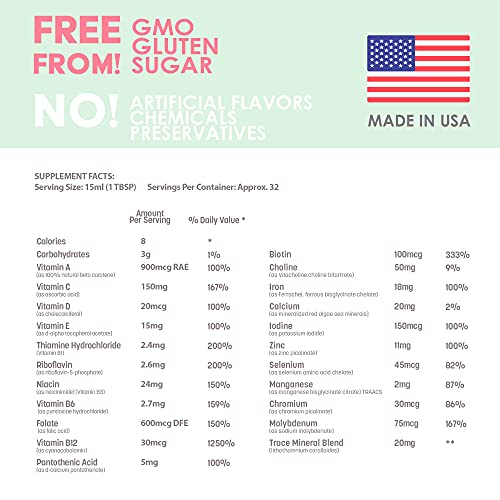 Liquid Prenatal Vitamins with Iron - Natural Folate, Calcium Supplement, Vitamin D, E, B6, Biotin, Choline, Pregnancy Multivitamin, Probiotics Plus Fiber, Non GMO, Sugar Free, Vegetarian, 32 Serving