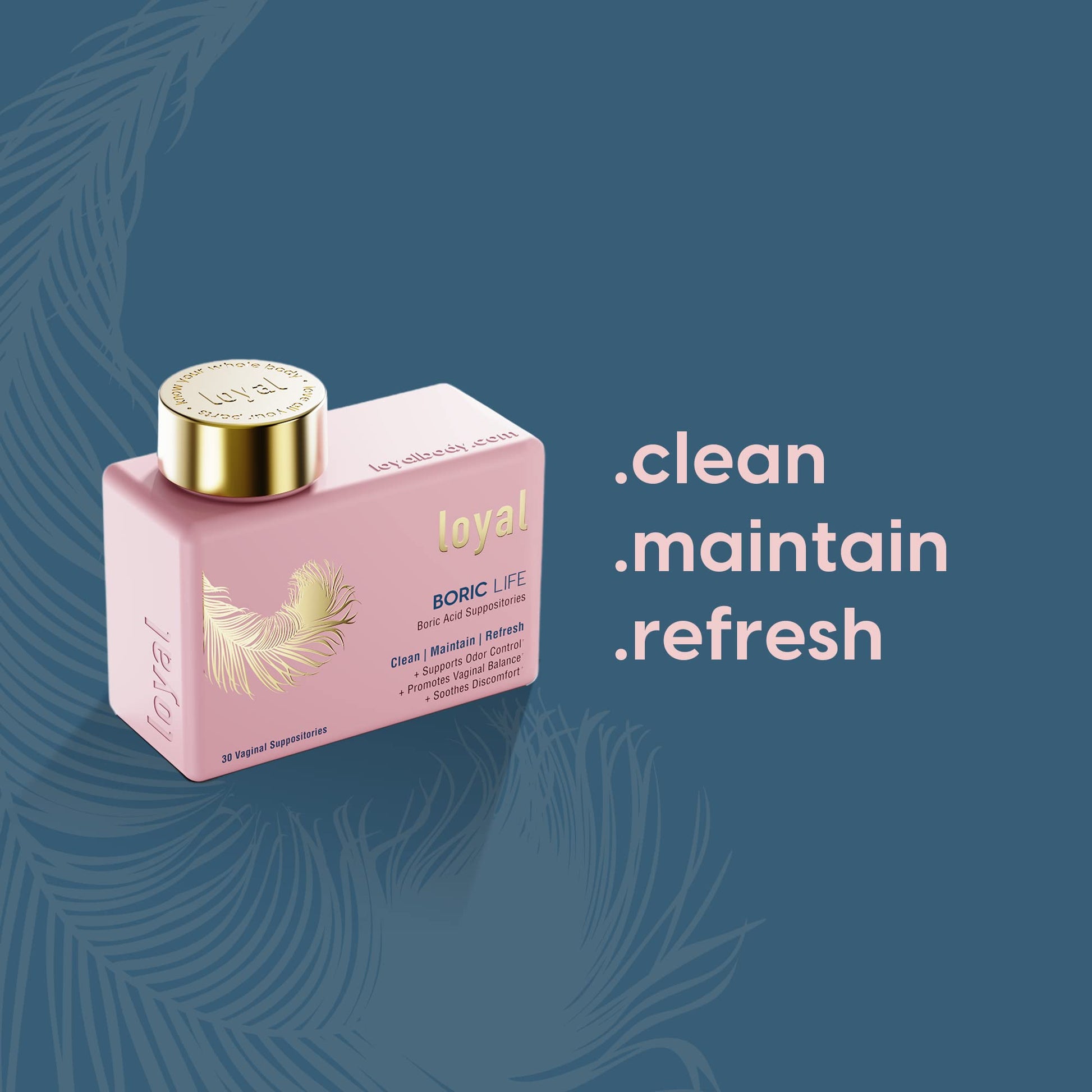 Details: Clean | Maintain | Refresh the holy grail of vaginal health Boric acid suppositories help to create a balanced vaginal environment. We love them for their soothing, deodorizing, and hydrating benefits. They also keep your vaginal pH levels in check. Go ahead and add them to your self-care routine for regular maintenance, especially after sex, the last few days of your period, or anytime your having hormonal imbalances. HOW DOES IT WORK: - Supports Odor Control - Promotes Vaginal Balance - Soothes Discomfort HOW TO USE: DO NOT TAKE ORALLY. Insert vaginally at bedtime for 7-14 days (repeat if symptoms persist) to balance the pH. We also like to keep Boric Life around for all the imbalances in our life: using a suppository after sex (semen has a pH of 7.1-8), the last few days of our period (pH of 7.4), or anytime our pH is off. Discharge is totally normal over the course of the night (we wear a thin pad to protect our panties from any mess). Avoid sexual intercourse during the use of the product. INSERT VAGINALLY Wash your hands with soap and warm water. Lie on your back with your knees bent toward your chest, or stand with your knees bent and your feet a few inches apart. Use an applicator or use your finger to insert the suppository. Gently insert (1) Boric Life suppository as far as it will go without feeling uncomfortable. Then, remove your finger or the applicator. Lie down for a few minutes to let the Boric Life absorb. Wash your hands again with soap and warm water. Store in a cool dry place, keep out of reach of children. WHY WE MADE IT Loyal’s commitment to Whole Body Balance means that everything we create supports your body’s natural pH.