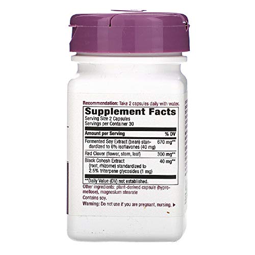 Natures Way EstroSoy 60 Vegetarian Capsules, Pack of 2. EstroSoy is made from fermented soybeans with a proprietary process. Fermentation yields more isoflavones and a diversity of supportive nutrients including beta glucan and glutathione. Because EstroSoy contains fermented soy, it delivers isoflavones (genistein and daidzein) in their NO, unconjugated forms that are easily utilized by the body. EstroSoy also contains black cohosh standardized extract to help relieve menopausal symptoms. Directions: Take 2 capsules daily with water. Ingredients: Fermented Soy (bean) providing 6.0 percent isoflavones (40 milligrams ) 670 milligrams, Red Clover (blossom) 300 milligrams and Black Cohosh Extract (root, rhizome) standardized to 2.5 percent triterpene glycosides (1 milligram) 40 milligrams. Other Ingredients: Plant-derived capsule (hypromellose), magnesium stearate. Contains soy. Contains No: artificial coloring, artificial flavoring, wheat, gluten, corn, dairy products, preservatives, salt, sugar, yeast.