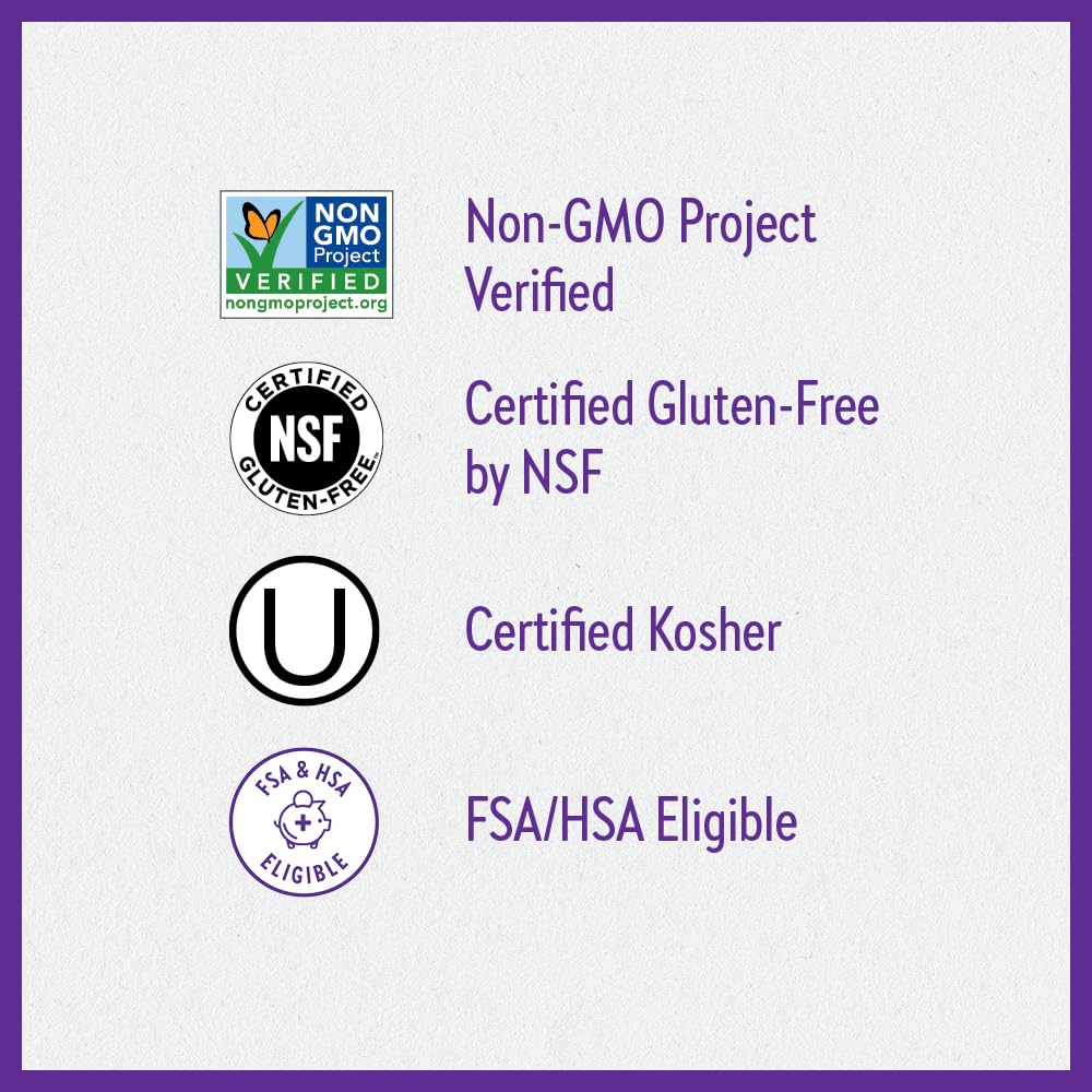 - Non-GMO Project Verified, 100% Vegetarian, Certified Kosher, Certified Gluten-Free by NSF, No Synthetic Fillers, No Artificial Flavors or Colors