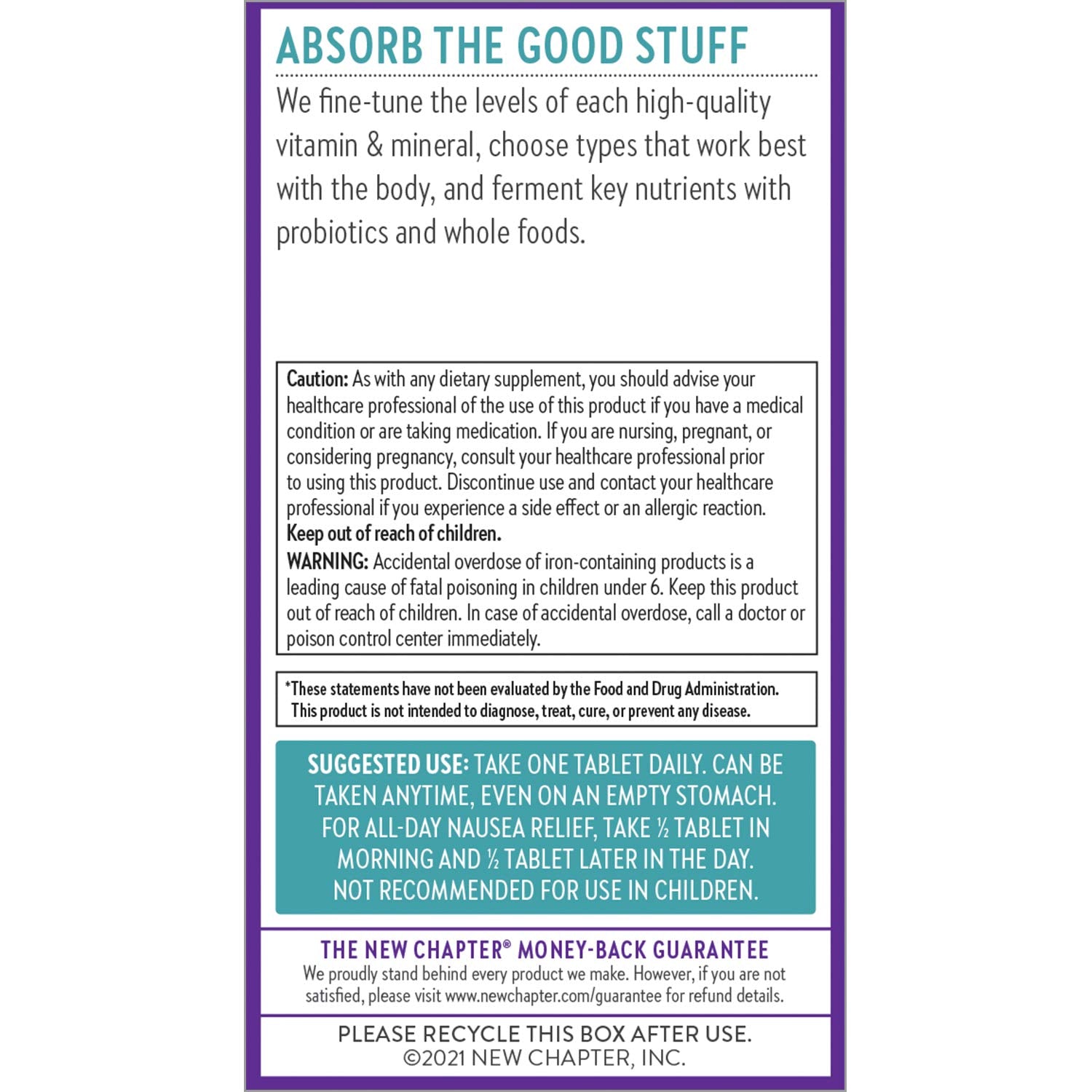 When you’re pregnant or planning to be, you’re looking to take excellent care of yourself—and New Chapter® is here to support that! This once-daily prenatal vitamin is crafted with essential high-quality vitamins and minerals to nourish baby and you, including cognitive-supporting Methylfolate & Choline, gentle non-constipating Iron, and a clinical dose of Ginger for nausea relief.* Expertly formulated for absorption, each one-daily tablet is packed with fine-tuned levels of nutrients, plus key vitamins & minerals are fermented with beneficial bacteria and whole foods. So gentle you can even take it on an empty stomach. *These statements have not been evaluated by the Food and Drug Administration. This product is not intended to diagnose, treat, cure, or prevent any disease.
