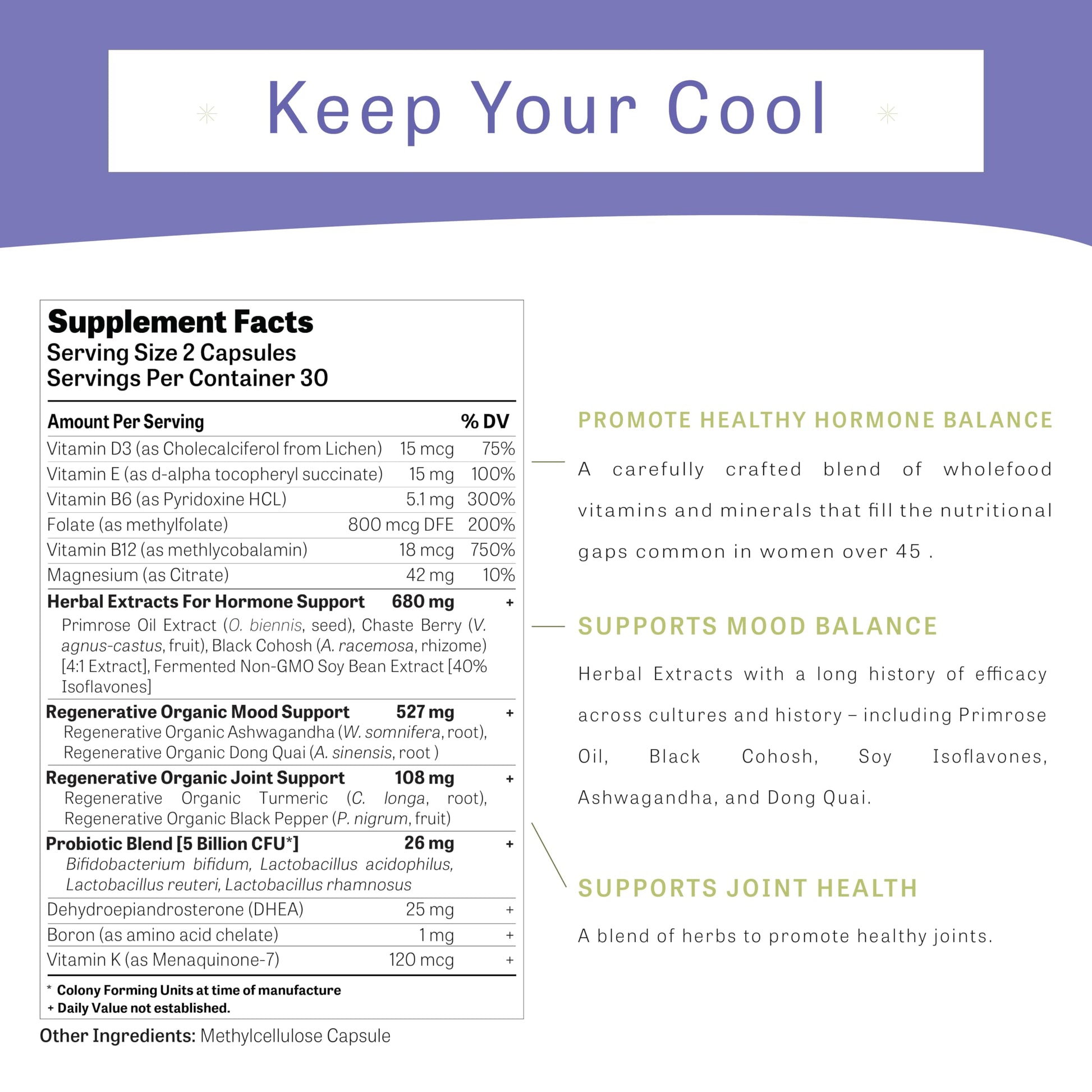 - Herbal Synergy for Support: Blending traditional wisdom with modern science, Keep Your Cool contains a fusion of herbs including organic ashwagandha and black cohosh to support your transition.