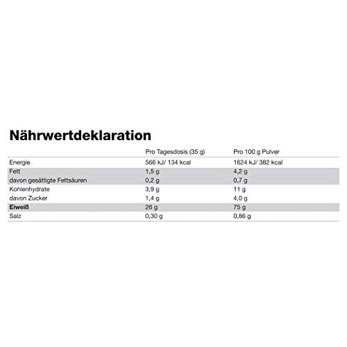 - Nutrition declaration per portion (35 g), Energy 566 kJ/134 kcal, Fat 1,5 g, of which saturates 0,2 g, Carbohydrate 3,9 g, of which sugars 1,4 g, Protein 26 g, Salt 0,30 g.