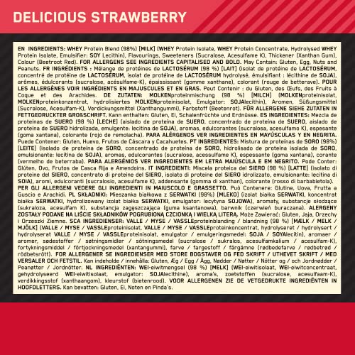 WHEY Protein Blend (98%) [MILK] (WHEY Protein Isolate, WHEY Protein Concentrate, Hydrolysed WHEY Protein Isolate, Emulsifier: SOY Lecithin), Flavourings, Sweeteners (Sucralose, Acesulfame K), Thickener (Xanthan Gum), Colour (Beetroot Red).