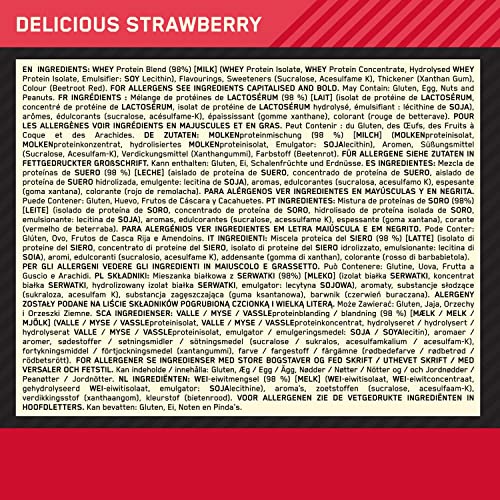 WHEY Protein Blend (98%) [MILK] (WHEY Protein Isolate, WHEY Protein Concentrate, Hydrolysed WHEY Protein Isolate, Emulsifier: SOY Lecithin), Flavourings, Sweeteners (Sucralose, Acesulfame K), Thickener (Xanthan Gum), Colour (Beetroot Red).