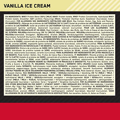 WHEY Protein Blend (98%) [MILK] (WHEY Protein Isolate, WHEY Protein Concentrate, Hydrolysed WHEY Protein Isolate, Emulsifier: SOY Lecithin), Flavourings [MILK], Thickener (Xanthan Gum), Sweetener (Sucralose), Colour (Curcumin).