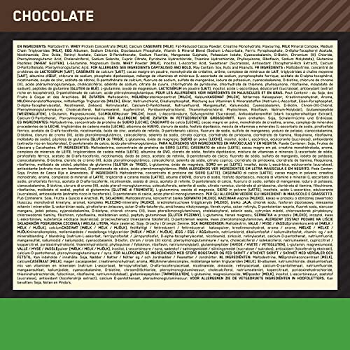Maltodextrin, WHEY Protein Concentrate [MILK], Calcium CASEINATE [MILK], Fat-Reduced Cocoa Powder, Creatine Monohydrate, Flavouring, MILK Mineral Complex, Medium Chain Triglycerides [MILK], EGG Albumen, Sodium Chloride, Dipotassium Phosphate, Vitamin & Mineral Blend (Sodium L-Ascorbate, Ferric Pyrophosphate, D-Alpha-Tocopheryl Acetate, Nicotinamide, Zinc Oxide, Retinyl Acetate, Calcium D-Pantothenate, Sodium Fluoride, Manganese Sulphate, Potassium Iodate, Cyanocobalamin, D-Biotin, Chromium (III) Chloride, Pteroylmonoglutamic Acid, Cholecalciferol, Sodium Selenite, Cupric Citrate, Pyridoxine Hydrochloride, Thiamine Hydrochloride, Phylloquinone, Riboflavin, Sodium Molybdate), Glutamine Peptides [WHEAT GLUTEN], L-Glutamine, Magnesium Oxide, WHEY Powder [MILK], Inositol, L-Ascorbic Acid, Sweetener (Sucralose), Antioxidant (Tocopherol-Rich Extract), Calcium D-Pantothenate, Pteroylmonoglutamic Acid.