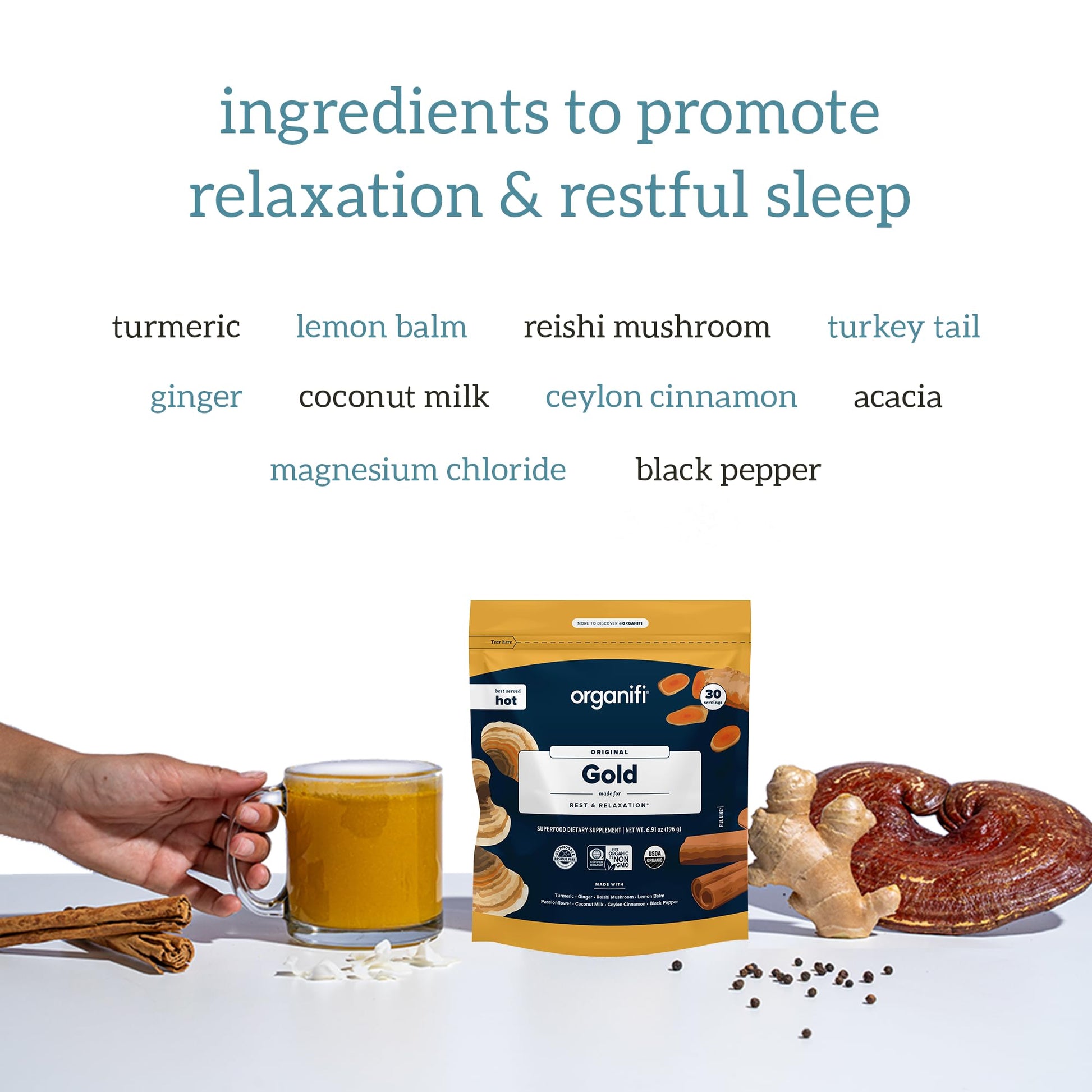 • Rest and Repair at Night: Organifi Gold is a soothing, creamy turmeric tea blend featuring unique superfoods and essential nutrients for nightly relaxation made easy and enjoyable.