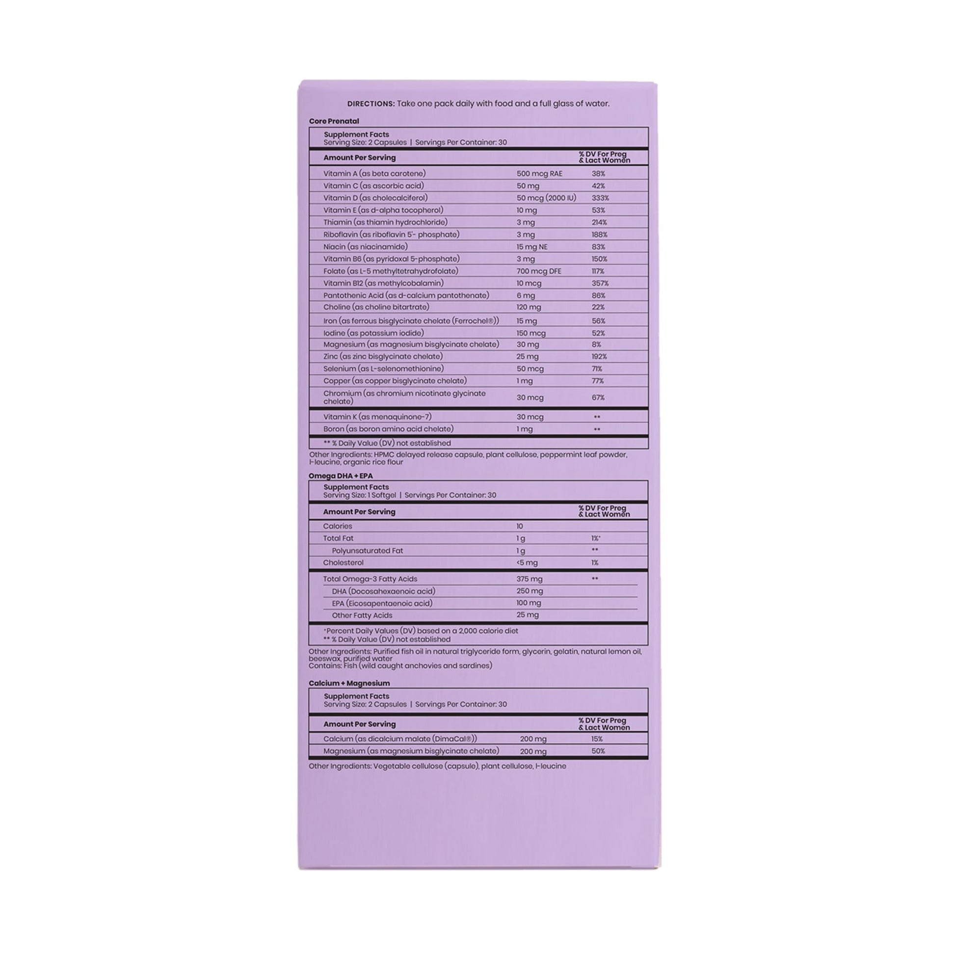 - What's Inside - Each pack contains two Core Prenatal capsules, one Omega 3 DHA + EPA softgel and two Calcium and Magnesium women's vitamins. Our Omega softgel uses prenatal DHA to support your baby's brain, eyes and central nervous system and EPA to support their heart and immune system.*