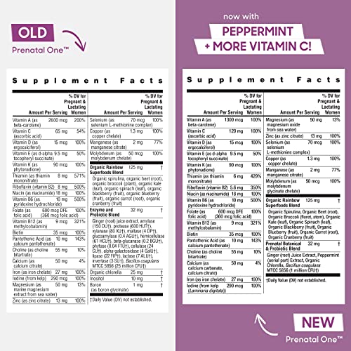 - VITAMINS: Prenatal One High-Potency Multivitamin has 100% daily recommended value of folate, iron and vitamin D; includes ginger, probiotics, peppermint and more vitamin C than our previous formula