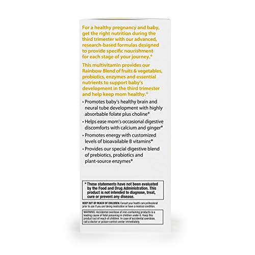 Details: Rainbow Light Trimester 3 Prenatal Multivitamin provides targeted nutritional support needed for the final months of pregnancy. This is customized nutrition that's more than a multivitamin! Each serving provides optimal nourishment to support your body during the third trimester. This is important because the period between conception and a baby's second birthday has been suggested by scientific evidence to be critical for future health. Poor nutrition during the first thousand days can result in pregnancy complications, low birth weight, mental and physical developmental issues and has been linked to development of certain disease states later in life. This product is Non-GMO Project Verified. This third-party process ensures products meet best practices for GMO avoidance. We use vegetarian capsules for optimal delivery. *These statements have not been evaluated by the Food and Drug Administration. This product is not intended to diagnose, treat, cure or prevent any diseases.