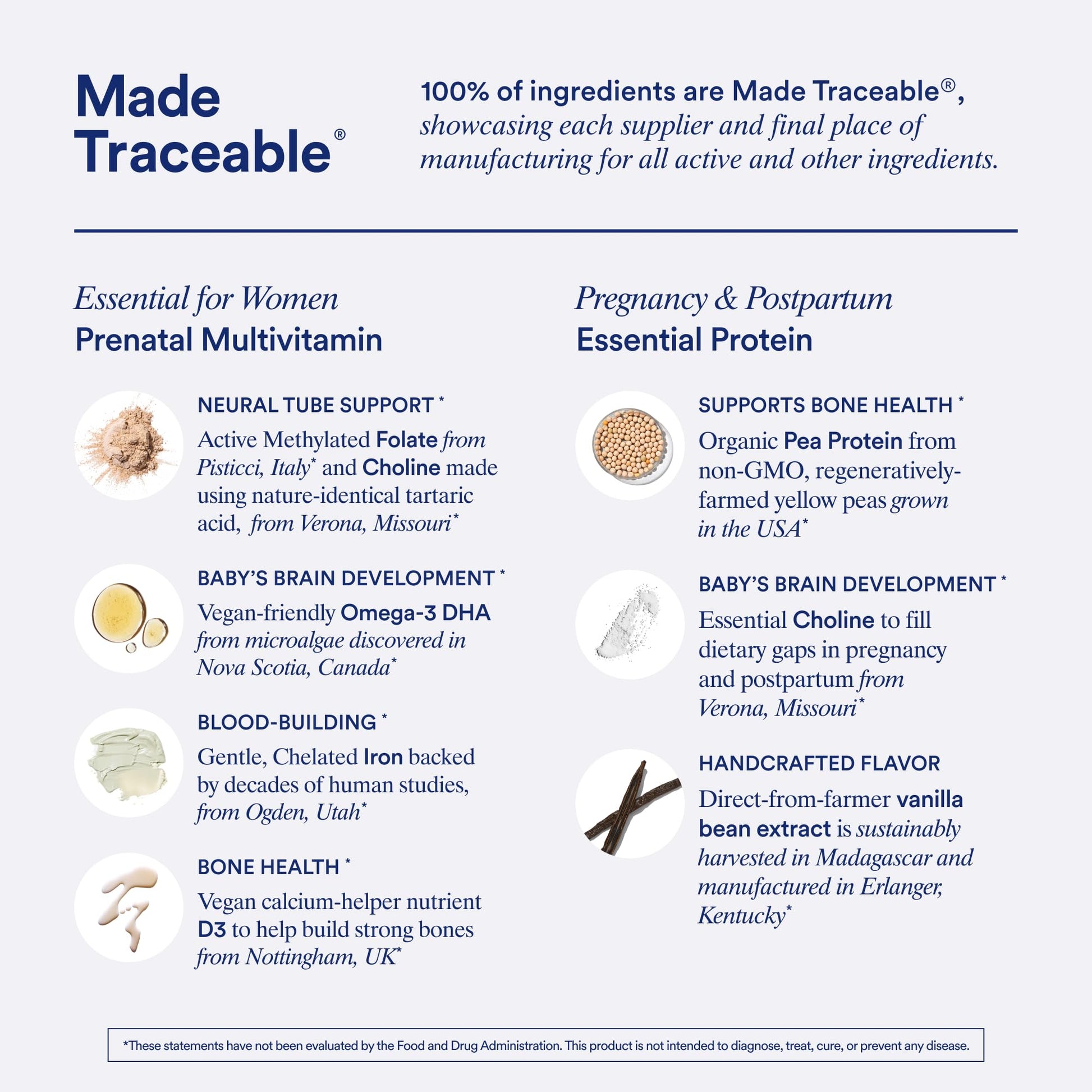 - MADE TRACEABLE: Our Prenatal Multivitamin formula includes Methylated Folate sourced from Pisticci, Italy and Choline sourced from Verona, MO for neural tube support; Omega-3 DHA discovered in Nova Scotia, CA to support brain development; and gentle, Chelated Iron, from Ogden, UT to support red blood cell formation. Our plant-based Essential Protein formula includes pea protein from regeneratively-farmed peas grown in the USA and Choline from Verona, Missouri.*