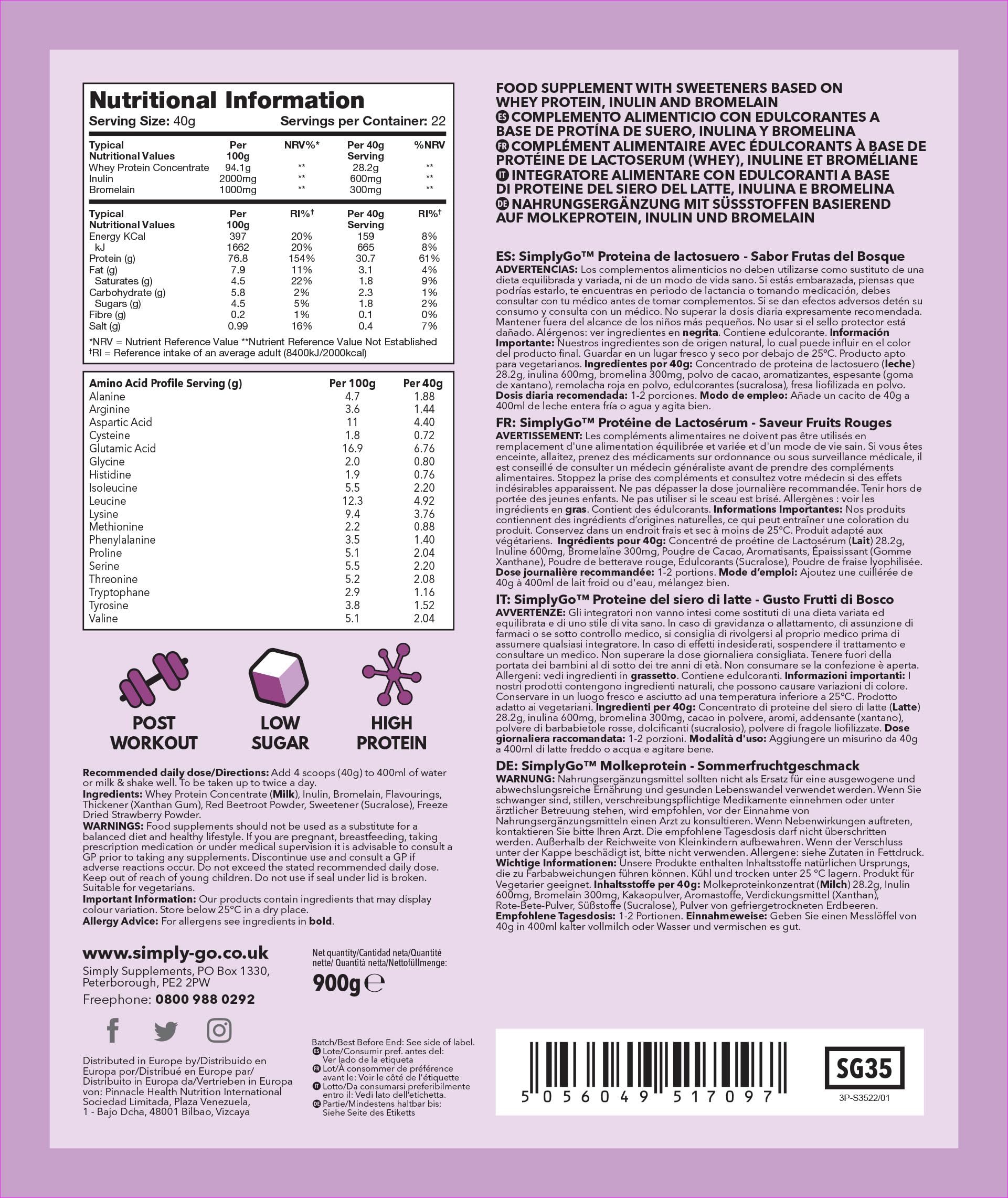 Details: Product description SimplyGo Whey Protein represents a high quality, tasty and convenient way to achieve your daily protein requirements. Whey protein supplements were once almost exclusively used by athletes and exercise enthusiasts, who can often require two or three times more protein than sedentary individuals. However, the plethora of research and positive attention on protein in recent years has seen supplementation become highly common in people of all ages, with a variety of different goals. It is well known that the macronutrient protein is required for the growth and repair of the body, with it being especially crucial for the health and strength of our muscles and bones. SimplyGo Whey Protein powder will make a significant contribution to these actions as it’s a premium quality protein source, not only boasting a high bioavailability but also containing all of the essential amino acids. SimplyGo Whey Protein powder is also renowned for its versatility. It is classically added to water, milk or smoothies, but many customers are now including it in baked goods and pancake mixes to elevate the protein content. Not all whey protein powders are known for their palatability however. Here at Simply Supplements we’ve worked diligently to create our protein powders in a range of tasty flavours. Ingredients Whey Protein Concentrate (Milk), Emulsifier (Soy Lecithin), Beetroot Extract, Flavourings, Anti-Caking Agent (Silicon Dioxide), Thickener (Xanthan Gum), Sweeteners (Steviol Glycosides, Sucralose), Acidity Regulator (Sodium Chloride). Directions Add one 30g scoop to 300ml water. Safety Warning Food supplements should not be used as a substitute for a balanced diet and healthy lifestyle. If you are pregnant, breastfeeding, taking prescription medication or under medical supervision it is advisable to consult a GP prior to taking any supplements. Discontinue use and consult a GP if adverse reactions occur. Do not exceed stated dose. Store in a cool, dry place. Keep away from children at all times. Do not use if seal under cap is broken.