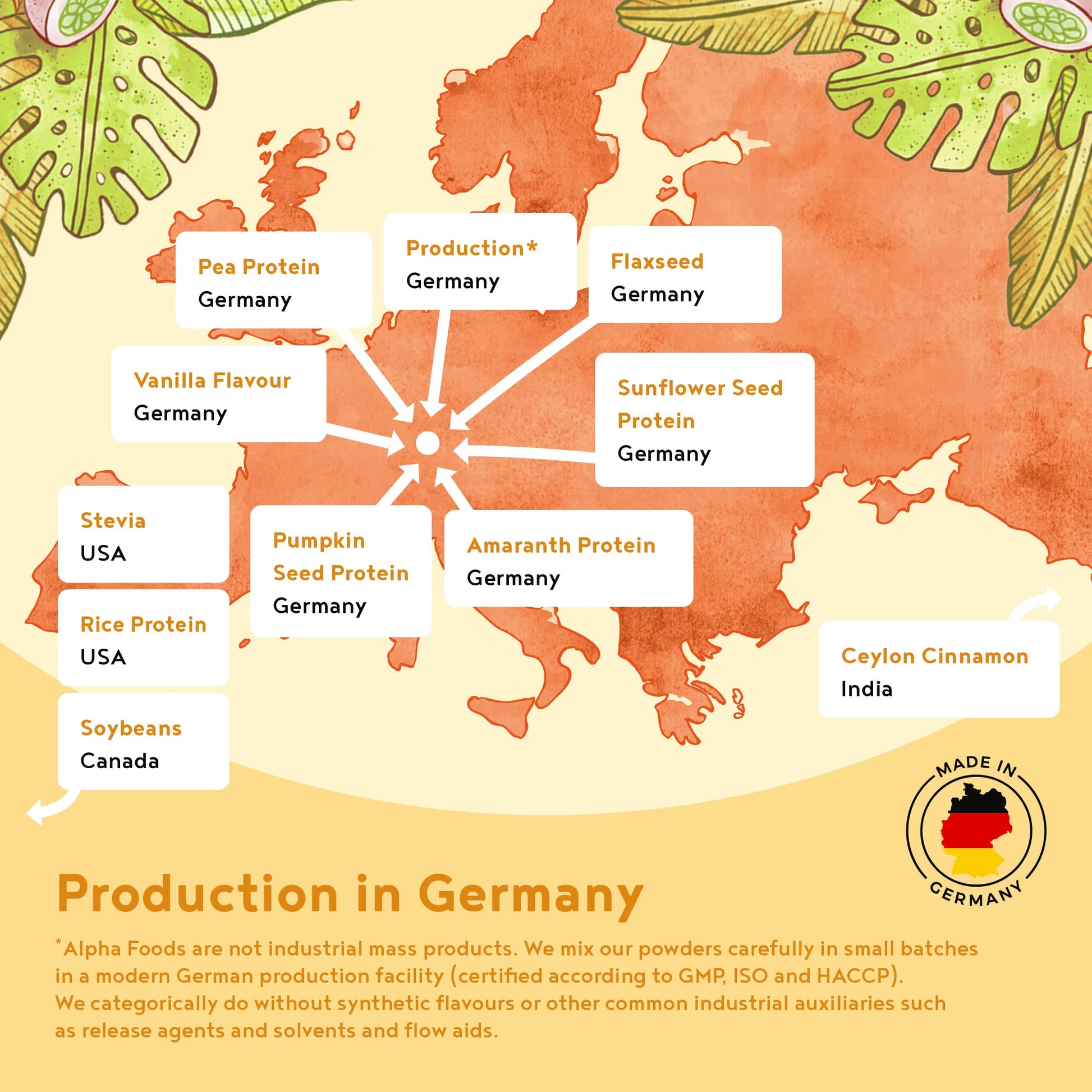 - ✦ NATURALLY DELICIOUS: We use only naturally extracted or distilled flavourings from real whole foods like vanilla beans, blueberries or cacao beans. This is then combined with creamy coconut milk powder and a dash of the finest Ceylon cinnamon for a heavenly creamy texture and the finest genuine taste of your vegan protein powder and shake. The Alpha Foods Vegan Proteins are not only perfect for a perfectly balanced nutrition shake but can be used in a variety of baking and cooking.