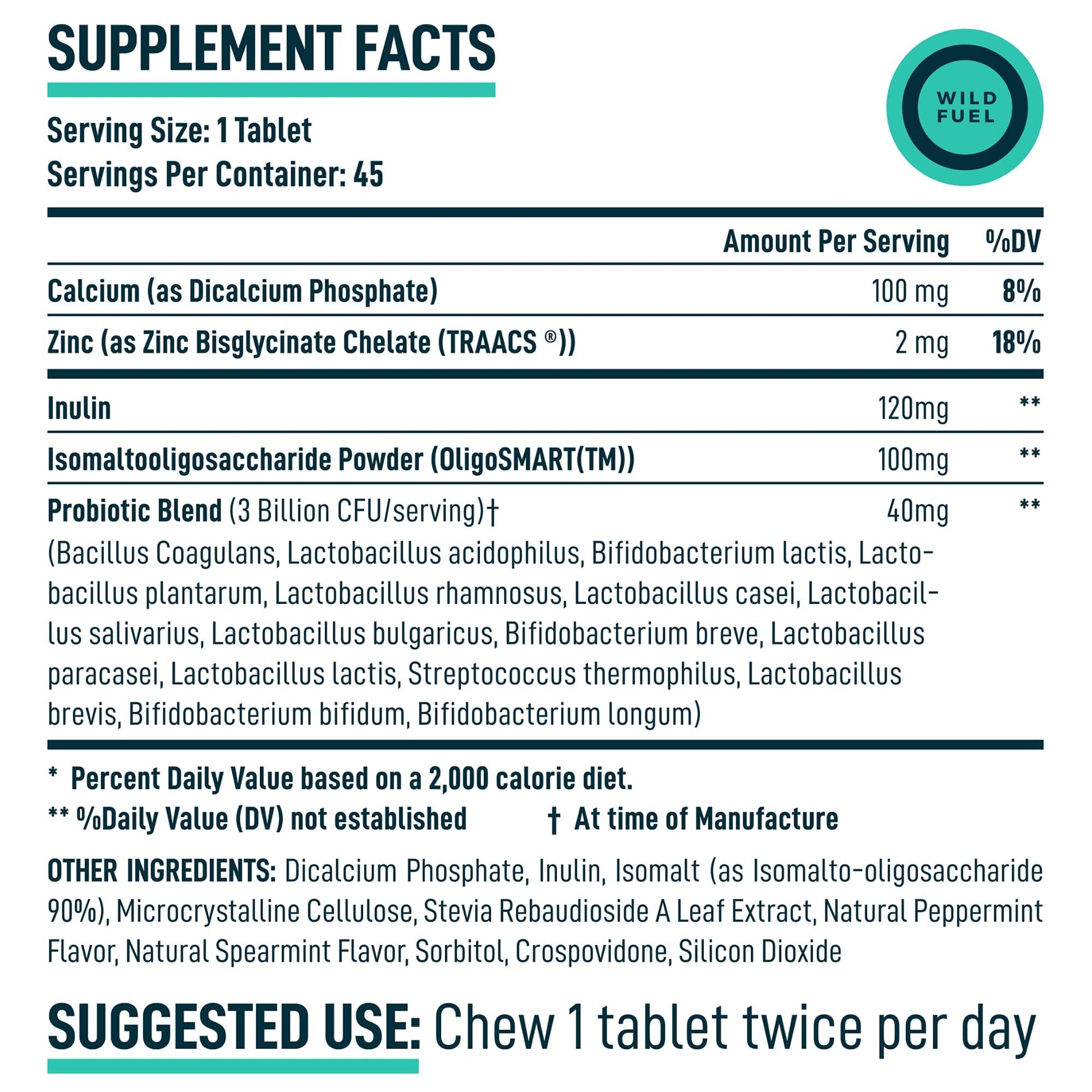 • Dental Probiotics for Fresh Breath - Fight Bad Breath, Restore Healthy Bacteria - Wild Fuel Vegetarian Oral Health Support - 3bn CFU Paracasei, Reuteri, Sakei, Salivarius - 45 Tablets in a Travel Tin