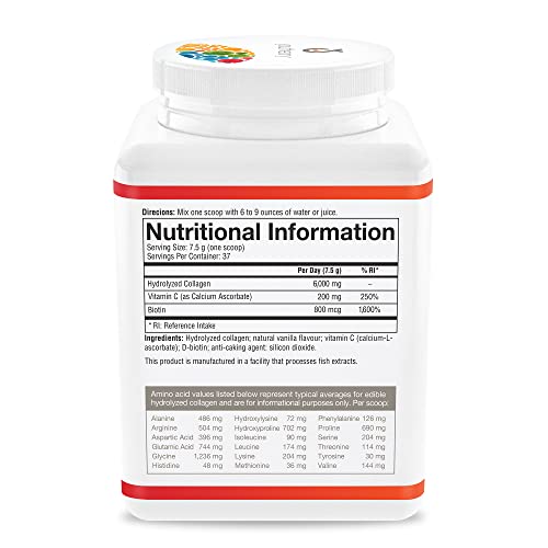 This product contains 200 mg Vitamin C, 2.5 mg Biotin, 6,000 mg Hydrolyzed Collagen (Bovine) per serving size of one rounded scoop (7.7g)